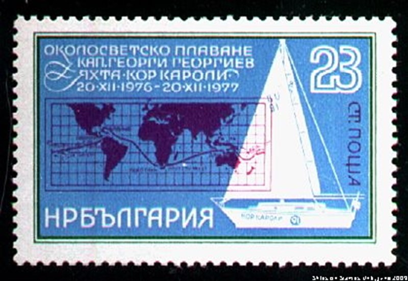 The Round the World Voyage of yachtsman Captain Georgie Georgiev (1976-77) was commemorated by the stamp depicting a map of his route and his yacht COR CAROLI.