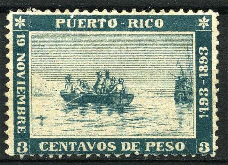 A Spanish commemorative postage stamp was issued on the occasion of the four hundredth anniversary of Columbus’ arrival in Puerto Rico in 1493, issued in 1893 when the island was still under Spanish rule. It is the only colonial-era Puerto Rican stamp that does not bear the face of the King of Spain.