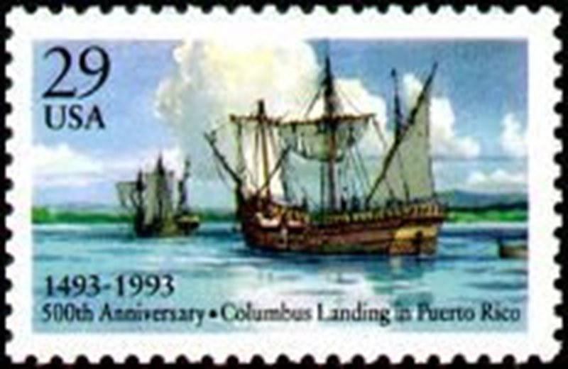 Columbus landing in Puerto Rico was commemorated in the USA with a stamp for the 500th anniversary on 19 November 1993. The stamp depicts two caravel ships approaching land. Selected post offices in Puerto Rico participated in local stamp ceremonies and offered special 500th-anniversary pictorial cancellations. Designed by artist Richard Schlecht.