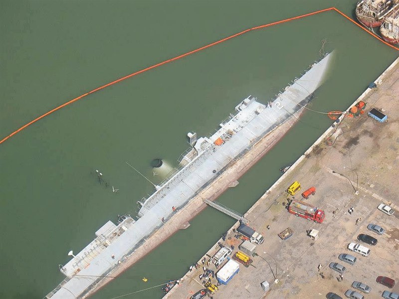 On 21 January 2013, SANTÍSIMA TRINIDAD suffered a broken valve which resulted in the flooding of several compartments. The flooding was beyond the capacity of the pumps and the crew was evacuated. The ship took on a 50-degree list and sank at her moorings. SANTÍSIMA TRINIDAD was in poor condition before she sank; the ship had been cannibalized to keep her sister HÉRCULUS operational, as the British refused to sell the Argentines spare parts after the Falklands War. In September 2014, specialists of the Argentine navy began an operation to raise the ship. In December 2015, SANTÍSIMA TRINIDAD was refloated and the Navy announced they plan to turn her into a museum dedicated to the 1982 war. This project seems to have been discarded by 2018.