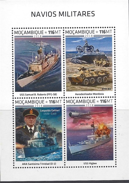 Mozambique 2018 issued a sheet with four stamps and a miniature sheet with warships.