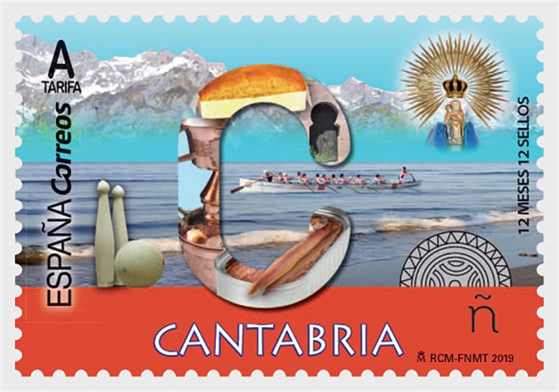 In Cantabria they bid farewell to September with the ‘Día de Campoo’ (Festival of National Tourism Interest) on which ‘Reinosa’ is at the centre of folklore and regional traditions. This ushers in October, the month dedicated to Cantabria in the 12 MONTHS 12 STAMPS series. The province of Cantabria is rich in archaeological sites of the Upper Palaeolithic, although the first signs of human settlement date back to the Lower Palaeolithic. The Altamira Cave paintings, dating back to 37000 B C, stand out in this respect. Along with nine other Cantabrian caves. The Picos de Europa mountains appear in the background of the stamp, a mountain range consisting of three perfectly defined massifs: the western or ‘Cornión’, the central or ‘Urrieles’, and the eastern or ‘Ándara’. The Naranjo de Bulnes or Picu Urriellu (2519 m), the Peña Vieja (2613 m), the Llambrión (2642 m), and the Torre Cerrado with its 2,646 meters is the highest summit of the Picos de Europa all rise from the central massif. 'La Virgen de la Bien Aparecida' is the patron saint of Cantabria. Her festival is held on 15 September and she can be found in a sanctuary in Hoz de Marrón (Ampuero). The image of the ‘Virgen Bien Aparecida’ is small (21.6 cm including the pedestal), possibly the smallest across Spain. It is no older than the fifteenth century and is still intact, covered with elaborately beautiful vestments. There are currently four versions of the Cantabrian bowling game 'Bolos'. Of the four, 'Bolo Palma' is the most well-known. The four versions are grouped into two families: 'Derribo', meaning ‘demolition’ (the object of the game is to knock over the most pins); 'Bolo Palma' and 'Bolo Pasiego' fall into this category. 'Pasabolos', meaning ‘pass the pins’ (the objective is to throw the balls as far as possible past the lines to gain the most points); 'Pasabolo Tablón' and 'Pasabolo Losa' fall into this category. 'Anchoas en salazón' (salted anchovies) date back to the Roman Empire (evolving from garum) and are documented as having been produced in Spain since the year 1250 when Alfonso XI granted the town of Laredo in Cantabria permission to make 'salazones' for the rest of Castile. It wasn’t until 1880, when the Italian fishing fleet set up a 'salazón' factory in Santoña, that the area became one of the largest producers in Europe. In making this product the anchovies (Engraulis encrasicholus) undergo a preparation process[ ] whereby after having been cleaned, filleted, salted and soaked in vegetable oil (olive oil), they are put into tins, glass jars, or wooden barrels.[] The Santa María de Lebeña Church is found in the beautiful region of Liébana, Cantabria, some nine kilometres from the capital, Potes, at the entry of Desfiladero de la Hermida, surrounded by immense white mountains that contrast the greenery around the monument. This church is a paradigm of the Mozarabic or ‘repopulation’ style demonstrating the three defining influences of the style: Asturian, Visigothic and Muslim. A detail of a copper alquitar still used for the distillation of 'orujo'. The Lebaniegos made 'orujo' in their homes for centuries, a tradition that has led to one of the most important industries in the Liébana region. Liébana currently produces different varieties of 'orujo' (a clear spirit). The most common variety is called 'Blanco', which comes directly from the alquitar; the other varieties are produced by mixing the 'aguardiente' with sloe, morello cherry, mountain ironwort (Sideritis hyssopifolia) or honey. 'Sobao pasiego', a protected area whose centre of production is located in the region of Pas, next to the region delineated by the rivers Pas and Pisueña. This is a sweet made from a mixture of wheat, butter, sugar and egg. It is served in squares, in cupcake paper (traditionally called a gorro or ‘hat’) folded to create the characteristic wings. A 'trainera' is, originally, a Cantabrian coastal boat propelled using oars and sometimes a sail. These boats were traditionally used for fishing but have now been modified, making them lighter for use in competitive fixed-seat rowing regattas with strict rules concerning weight, dimensions, etc. The standard measurements are 12 m in length, a 95 cm bow, a 75 cm stern, a hold depth of 60.5 cm and a minimum beam length of 1.72 m. Today, a “trainera” crew consists of 13 oarsmen and one cox. The photograph that appears on the stamp is the work of artist Ángel Obregón. The 'Barros Stele', one of the Cantabrian Stelae, is a gigantic stone disc from the 4th century BC found in Barros (a region of the Los Corrales de Buelna municipality in Cantabria), which was declared a place of cultural interest in 1985 It is 1.66 m in diameter and 0.40 m thick, and rests on a base measuring 1 m in height and 0.80 m in width, an impressive size for a work of this type. It is made from natural sandstone. Today it is located in the Barros 'Parque de las estelas' (‘Stelae Park’), which opened in 2001. The red stripe along the bottom represents the red of the Cantabrian flag.
