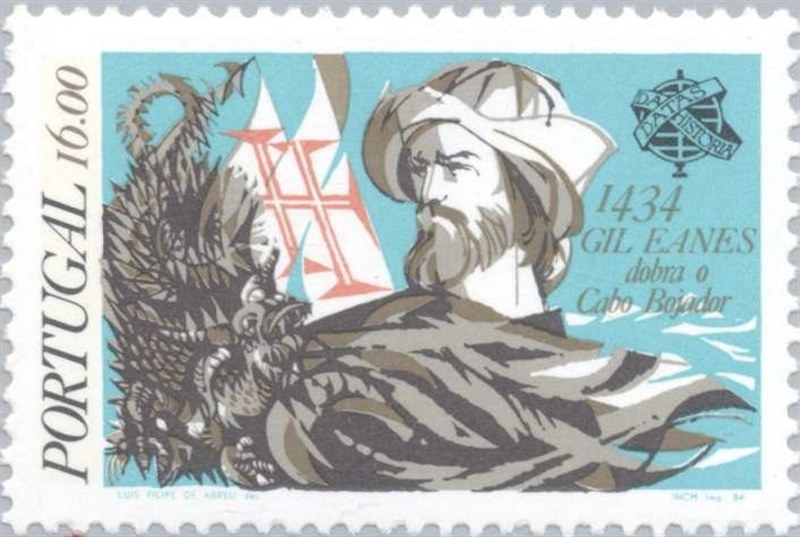The stamp shows us a sea-monster and a drawing of Gil Eanes and in the background the sails of a caravel, which is wrong Eanes used a “barinel” when he rounded Cabo Bojador, which has a square sail. viewtopic.php?f=2&t=15302&p=17664&hilit=gil+eanes#p17664