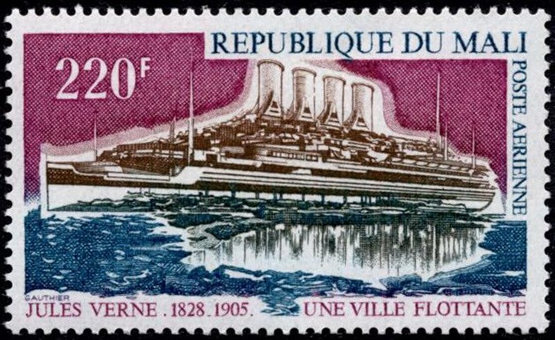 Mali used in 1975 one stamp of 220F for Jules Verne book “The Floating City” which shows us a four funnel passenger ship, the ship has not much to do with the novel, and she is not identified.