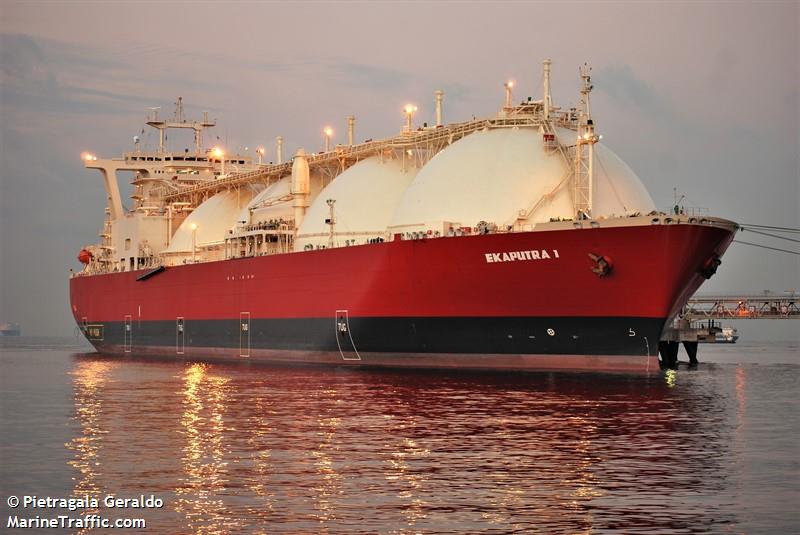 EKA PUTRA. Liquefied Gas Tanker. Built in 1990 by Mitsubishi Heavy Industries Ltd. Nagasaki, Japan for Cometco Shipping Company Monrovia, Liberia (Mngs. Humolco Trans. Inc) 109258Gt. 32777Nt. 78988 Dwt. L290m. B46.090m. Dr11.826m (25.51 m) Two S Turbines with flexible couplings & dr. geared to sc. Shaft. 26680shp. (19.625Kw) 17.5 kn. Is classified as an LNG pressurised gas carrier ship type 2G. She can also carry methane in independent type B tanks. Max. Pressure 0.245bar. Min temperature minus 1620.