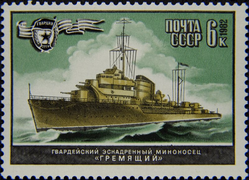 The Russian destroyer depict on this stamp is given in source as GREMJASCHTSCHIJ, GREMYASHCHY, GREMYASCHIY, GREMYASCHI or GREMIASHI. The design of this class was produced with Italian assistance. 23 July 1936 keel laid down under yard No 515 on the Zhdanova yard, Leningrad for the Soviet Navy. 12 August 1937 launched under the name GREMYASNCHY one of the Gnevny class. Displacement 1.885 ton standard, 2.405 ton full load. Dim. 112.86 x 10.2 x 4.1m. (draught). Powered by two sets Tosi geared steam turbines 56.000 shp, twin screws, speed 38.5 knots. Range 2.565 mile by a speed of 19.5 knots. Armament 4 - 130mm, 2 - 76mm, 3 - 37mm, 4 - 12.7mm M.G. and 6 - 533mm torpedo tubes. Carried also 48 mines and 30 depth charges. Crew 236. 28 August 1938 commissioned.