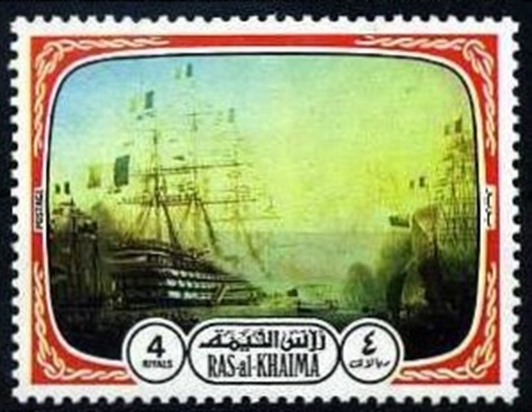 The stamp of Arab emirate RAS AL KHAIMA-4riyals-copy of a picture: «Napoleon III receiving Queen Victoria at Cherbourg, 5 August 1858».