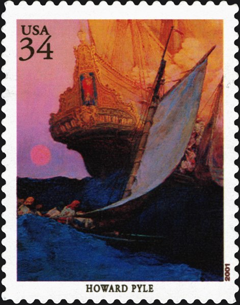 The stamp shows Pyle's painting An Attack on a Galleon, from his 1905 story "The Fate of a Treasure-Town," published in Harper's Monthly Magazine. https://en.wikipedia.org/wiki/Galleon