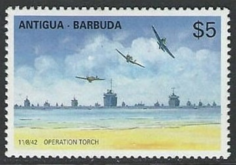 Antigua & Barbuda issued a stamp of $5 in 1991 which shows us the landings of the Allied in Operation Torch, where this landing took place depict on the stamp I could not find out.