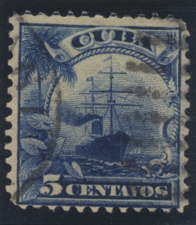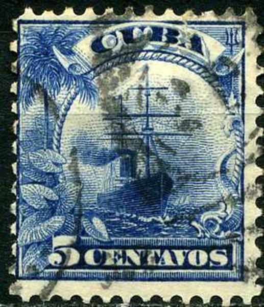AFTER the Spanish‑American War, the United States Government took over the administration of Cuba, and a set of five stamps, with face values of one, two, three, five and ten cents, was ordered from the Bureau of Engraving and Printing at Washington, to cover all Cuban postal requirements. These stamps were in use from 1889 to 1902. The five cents stamp, illustrated here, depicts the Cunard liner Umbria. The vessel is shown in her original barque rig, characteristic of all Cunarders of that day. Eventually the sails and yards were taken off the liner, modernising her appearance but detracting from her beauty.