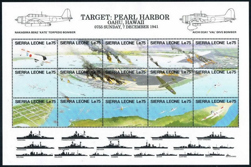 In 1991 Sierra Leone issued a mini-sheet all Le 75 for the 50th Anniversary of the attack on Pearl Harbour, on the border of the sheet the following USS ships are depict.