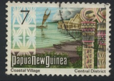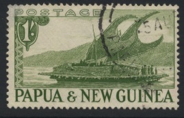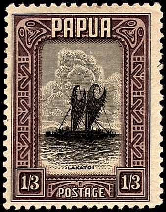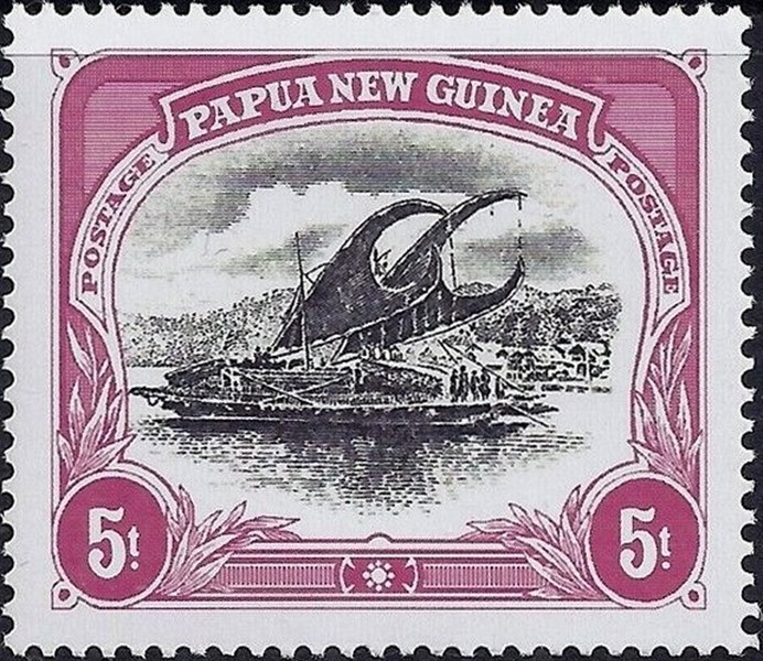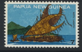 The 7c stamp shows a lagatoi (lakatoi) of the Motuan people, who originally came from the distant West and have always been recognised as seafarers and travellers. When the Christian martyr, Rev. James Chalmers, was alive, the Motu tribe controlled coastal waters from Bald Head in the West to Kerepuna in the East. They numbered 2,000 strong and were inveterate traders, exchanging their local clay pottery utensils for the much-prized sago palm. The missionary described the lakatoi and its crew as follows: ‘There are six officers in all — one fore and one aft, two for the mast and two for the sail. For a long time the captain has been sacred.”