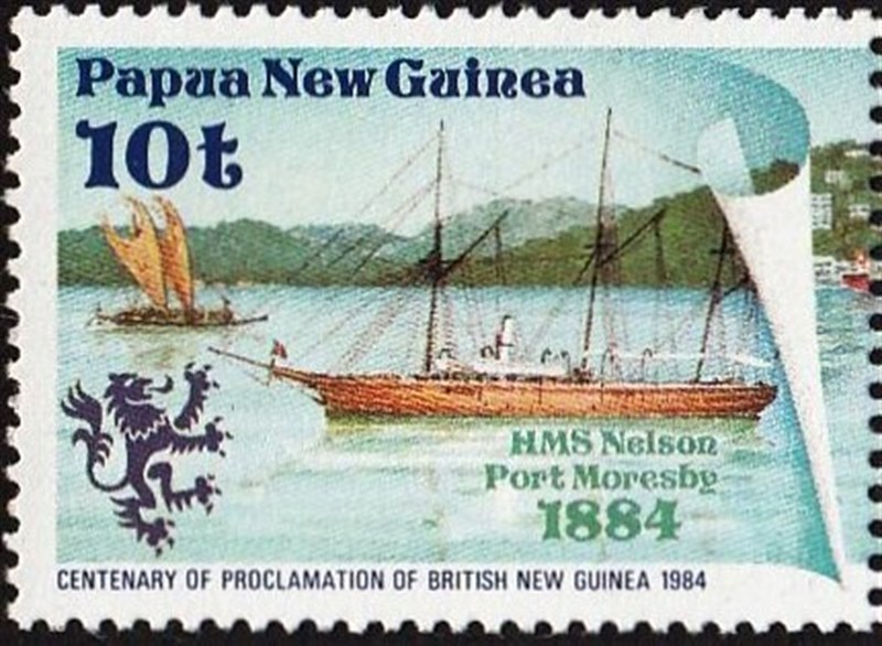 Papau New Guines 1988 35t sg 575, scott? 2002 sg919/24 and sgMS 925 13.10K and 1984 10t sg 487, scott The lakatoi is on the left of the stamp. The other vessel is HMS NELSON of 1876. (most probably HMS ALERT of 1876 is depicted and not HMS NELSON)