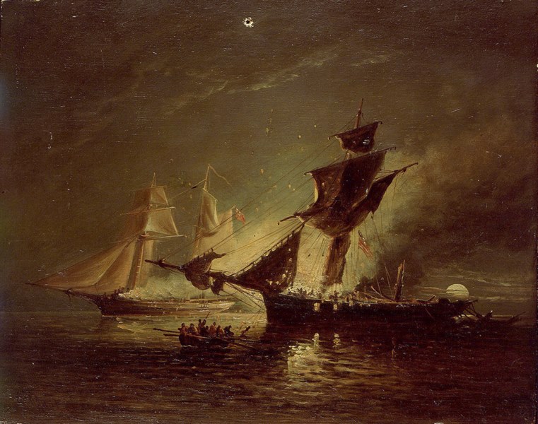 On the morning of 5 June 1829, while cruising off the north-west coast of Cuba, HM Schooner PICKLE discovered a strange sail. This she stalked until she had interposed herself between the stranger and land. She closed in on her after nightfall. Action then commenced and after 80 minutes the slaver, as she proved, surrendered. She was the Spanish topsail schooner VOLADORA - though English references tend to use BOLODORA - with a crew of 60 of which 10 were killed. The ‘PICKLE’ had only half that number in her crew of which one was killed outright and three died later. The prize was taken to Havana with some difficulty as she had to be jury rigged and the prisoners were in the majority. They and the slaves were delivered to the Spanish governor. The painting shows the night scene with the event being lit by the flash of the guns and slightly by the moon seen low over the BOLODORA’s stern. In the right foreground she is shown broadside-on and flying the American flag. Her mainmast shot away, she is trailing rigging over the stern and her sails are much cut up. She is shown silhouetted against the gunfire and explosions as the fight continues with ‘PICKLE’ beyond her on the left. In the centre foreground is a boat full of people escaping from the action. The painting is based on a print by Edward Duncan after William John Huggins, published in 1831 (see PAG9091). This calls the slaver 'BOLODORA', though this painting was acquired in 1950 with the spelling 'BOLODORA. VOLADORA - the ship's Spanish name- can mean 'flying fish' or refer to a witch who could turn herself into a bird in the mythology of Chiloe (an island on the Chilean coast), either appropriate for a fast and elusive vessel. The artist, usually called John Moore of Ipswich was born in 1820 (and died in 1902), so it may be a considerably later version.