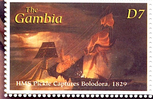 HMS Pickle shown on this stamp was the third Pickle and was a schooner of 5 guns, launched in 1827. She was involved in the suppression of the slave trade, and achieved fame for capturing the armed slave ship Boladora off the coast of Cuba on 5 June 1829. She was broken up in 1847.