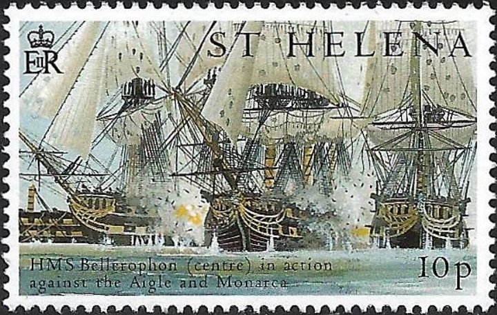 St Helena 2005 10p sg 939 Scott? ((the ship on the right is the AIGLE and on the left of the BELLEROPHON is the Spanish MONARCA, who got a broadside in her stern from the BELLEROPHON as seen on stamp)