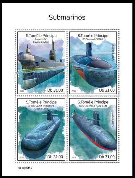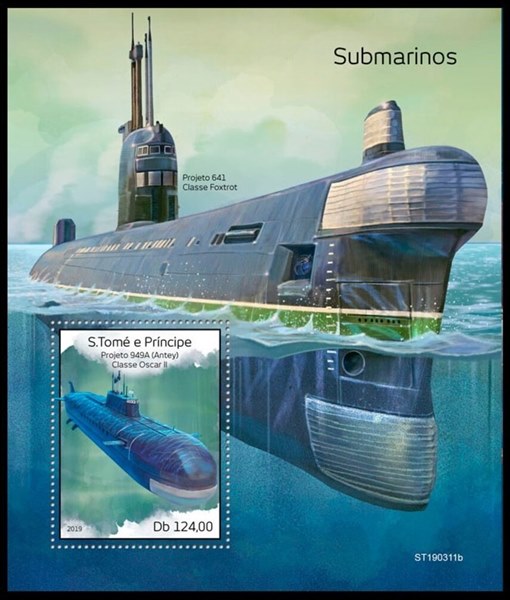 S Tome et Principe issued in 2019 a series of stamps and a miniature sheet with submarines.