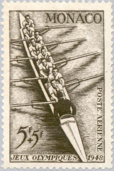 For the summer Olympic Games 1948 in London, Monaco issued a series of stamps which shows us on the sg 348 an 8-person rowing boat with a coxswain