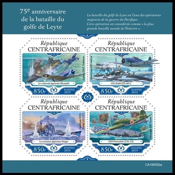The Central African Republic issued in 2019 four stamps and a miniature sheet for the 75th Anniversary of the Battle of Leyte Gulf.