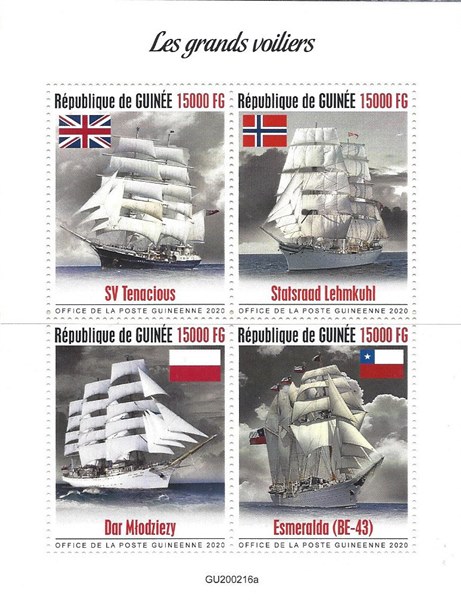 Guinea issued in 2020 four stamps and a miniature sheet with “tall ships”