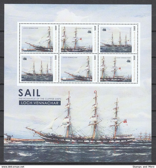 These runs kept up, with remarkable steadiness and freedom from accident, until Captain Bennet could claim an average of 86 days for 12 homeward runs. Throughout the ‘80’s Loch Vennachar put money into the pockets of the underwriters, but in 1892 Captain Bennet received a clear warning from the gods that her luck was changing. The Loch Vennachar was unfortunate enough to run into an Indian Ocean cyclone. It is interesting to read the account as given in the "Melbourne Argus": "The Loch Vennachar left Glasgow, bound for Melbourne, on April 6th, 1892, with a crew of 33 all told and 12 passengers, 4 of whom were ladies. All went well with the ship until she reached Lat. 39 degrees 55’ S., Long 27 degrees 21’ E., when at eight o’clock on the evening of June 3rd the barometer began to fall ominously and sail was promptly shortened. Darkness lifted soon after five o’clock in the morning and the break of day showed the terrific head seas that swept down upon the vessel, lashed by the North-East gale. At this time both watches were aloft fighting to make the foresail fast. Captain Bennett, who was on the poop, saw the danger of his crew and at once resolved to sacrifice the sail. He sang out to the mate to send the men aft and the hands, who had been laying out on the pitching fore yard, gained the deck in safety and reached the poop in time. As they did so, two enormous waves bore down upon the ship, which rode slowly over the first, and sank to an interminable depth in the trough at the other side. Whilst in this position the second wave came on, towering half-way up the foremast, and broke on board, filling the lower topsail 60 feet above the deck as it came. Hundreds of tons of water swept over the ship in a solid mass from stem to stern, thundering inboard on the port side of the fo’c’sle and racing away over the main-deck and over the poop, where most of the crew were standing. Every man on the poop was thrown down, and when they regained their feet they perceived that the foremast and mainmast were over the side, and the mizen topmast above their heads had disappeared. Not a man on board actually saw the spars go or ever heard the crash of the breaking rigging, so violent was the shock and so fierce the howling of the hurricane. The cook was washed out of his galley, and swept overboard, the galley being completely gutted of everything in contained." Without her masts to steady her, the Loch Vennachar rolled fearfully in the tremendous seas. They could not rig any jury-masts for nine days, when at last the seas moderated enough to rig a spar forward which, with sail on the mizen, took the ship into Port Louis, Mauritius in five weeks. She had to stay her for five months while new spars were sent from England. It took Captain Bennett just ten days to repair his ship once the new spars arrived. She finally arrived in Hobson’s Bay on December 22nd, 260 days from the Clyde. As soon as her anchor was down, her crew came aft in a body and gave Captain Bennett three stentorian cheers of gratitude and congratulations. He also received Lloyds medal for his fine work.The only other accident of any account which the Loch Vennachar suffered during her long and successful career was a collision in the Thames. Upon arriving in 1901 with the best wool passage of the wool season, being 86 days out from Melbourne, she anchored off the Mucking Light. Just before down she was cut down and holed on the starboard bow by the Hull steamer Cato, one hand being seriously injured. She rapidly sank in 40 feet of water, but all hands, along with the parrot and cat, got clear safely. She rested on the bottom of the Thames for a month before being raised and repaired, resuming her old place in the Melbourne trade. In 1904 Captain Bennett retired and Captain W. S. Hawkins took command. The beautiful wool clipper was lost with all hand in 1905, when outward bound to Adelaide. It is believed she was wrecked on the Young Rocks, a granite outcrop about 20 miles S.S.W. of Cape Gantheaume, as some wreckage belonging to Loch Vennachar was found in the area. The design stamp is made after painting of Jack Spurling.
