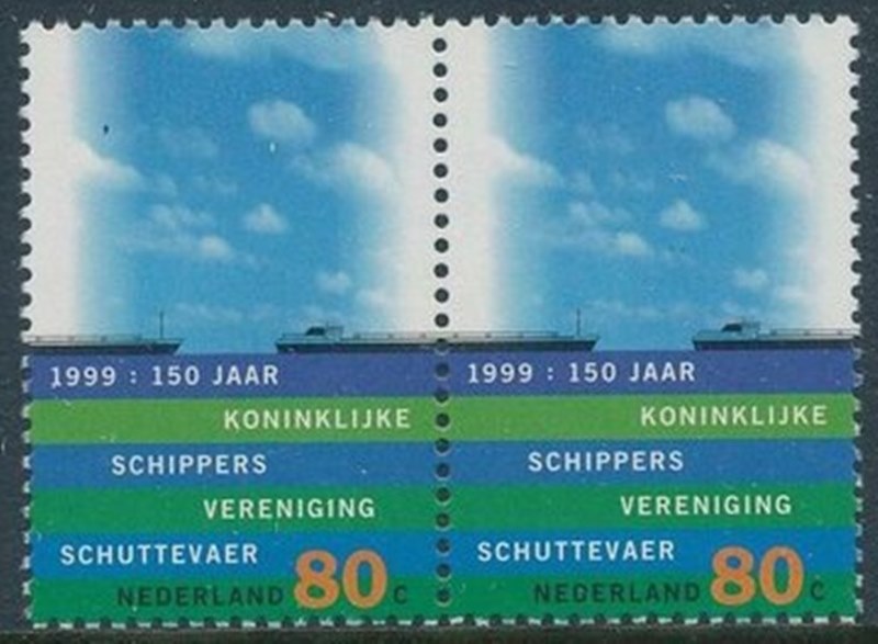 Two stamps issued in 1999 designed by De Designpolitie in Amsterdam are dedicated to jubilees in the Dutch shipping world: