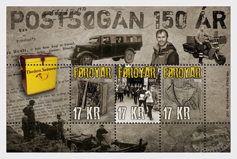 We have chosen to celebrate the two anniversaries with an anecdotal look back in time at fragments of Faroese postal history. These little tales are told on a souvenir sheet containing three stamps.