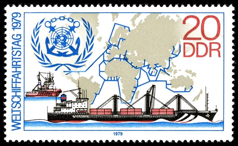 On the stamp you can also find on the background of the stamp a world chart with the liner services of the Deutfracht, the IMCO emblem and a tug, which is identified by Peter Criton as the STURMVOGEL.