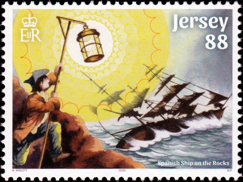 The 88p stamp illustrates the tale of the Spanish Ship on the Rocks. On the west coast of Jersey, during the 15th century, 'salvagers' purposefully wrecked Spanish ships for the loot by using fires, meant to guide the ships to safety, to guide them into dangerous rocky seas. An old man onboard one of the ships begged the salvagers to save his daughter, but they did nothing to help. The old man cursed the wreckers, saying that they would all be drowned within the year. A year on, celebrating the fact they had beat the curse with a huge feast, the ship wreckers were dragged into the sea by an almighty storm.