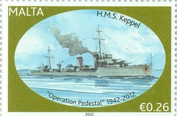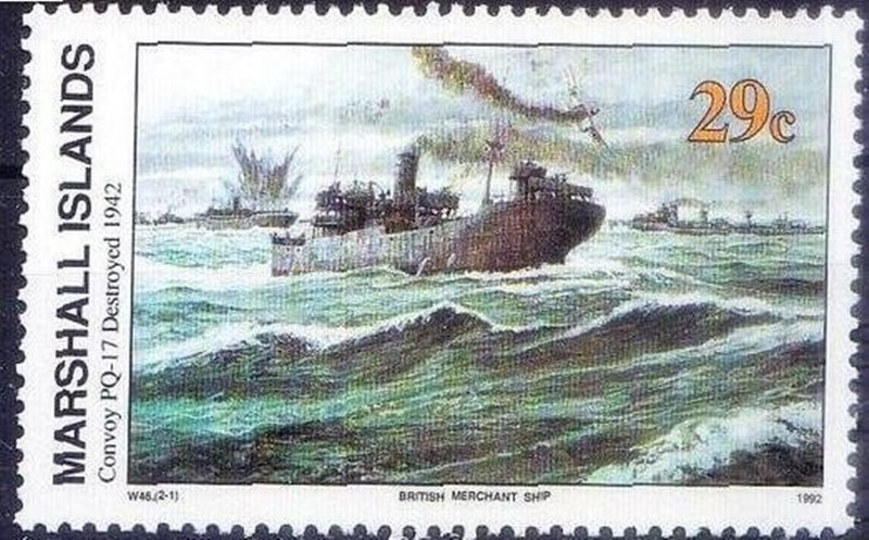 The stamp issued by the Marshall Islands in 1992 shows the "Convoy PQ-17" in the right of the stamp is according Watercraft Philately depict the British destroyer HMS KEPPEL and I agree.