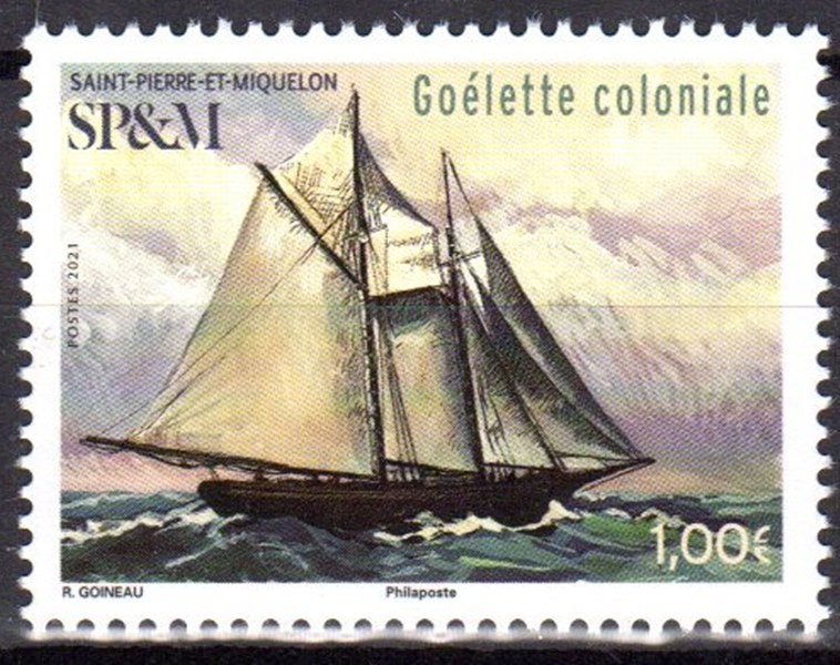 In 2021 St Pierre et Miquelon issued one stamp which shows us a “Goélette Coloniale” (Colonial schooner) used for fishing in the waters around St Pierre et Miquelon and the Grand Banks.
