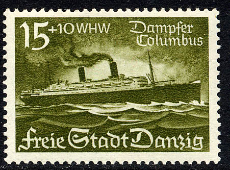 Danzig, close to Gdynia, in her Free State days issued an excellent set of stamps showing liners built in the port's well-known shipyard. The 15 + 10 pf. stamp of this series shows the Norddeutsher Lloyd's Columbus with two tall raking funnels as she originally emerged from the Schichau yard at Danzig in 1923. In 1929 the Columbus was re-engined, single-reduction geared turbines replacing the original triple-expansion units and her speed was increased from 19 to 23 knots. At the same time she was given two squat funnels so that her appearance would conform with the Bremen and Europa.