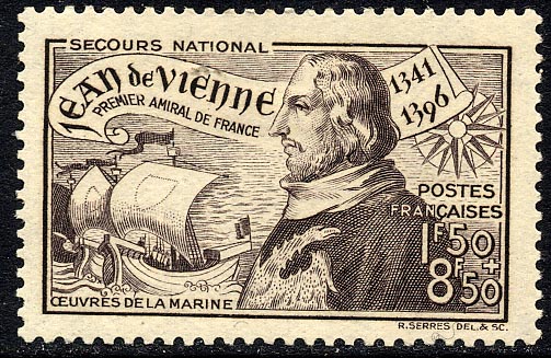 Admiral Jean de Vienne and two of his ships are shown on a French stamp. He was made First Admiral of France in 1373, and was an antagonist of Britain in. the Hundred Years War. In 1377 he attacked various parts of the South Coast with a fleet of 35 ships and 13 galleys, and left the port of Rye in flames. In 1380 he attacked in turn the Isle of Wight, Jersey and Guernsey. He also took a prominent part in Mediterranean naval operations. It will be noticed that the ship next to the admiral has a rudder, the earliest vessel on stamps to show this important invention, although it was known 200 years earlier.