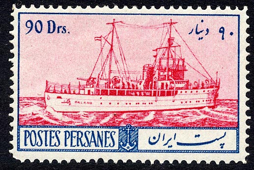 The Persian gunboat Palang, on the 90 dinars stamp of 1935, was built by the Cantieri Navali Riuniti at Palermo and was completed in November 1931. Her two diesel engines gave her a speed of 15 knots, and she had a tonnage of 950. She was armed with two 4in. and two 3in. anti-aircraft guns, and her length was 95011. She was sunk by gunfire of H.M. ships in August 1941 at Abadan.