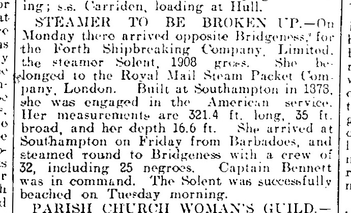 12 May 1902 arrived as rescue ship at Saint Pierre, Martinique after the Mount Pelée eruption in which at least 35.000 people died. Crew of the SOLENT found one man in a cell in the town jail, but he died two days afterwards.