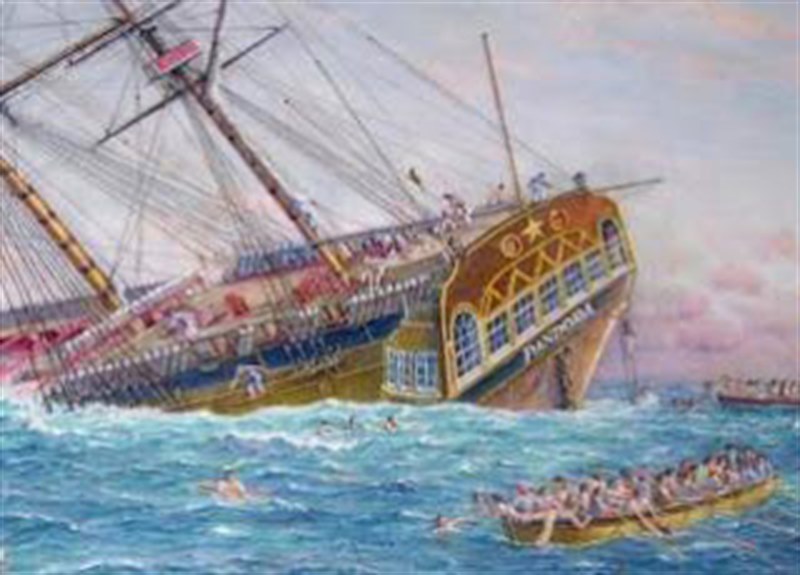 HMS PANDORA sank on 29 August 1791, on the outer Great Barrier Reef, while returning home from its mission to locate the mutinous BOUNTY crew in the Pacific Ocean. In total, 35 lives were lost during the wrecking including four of the captured BOUNTY mutineers.