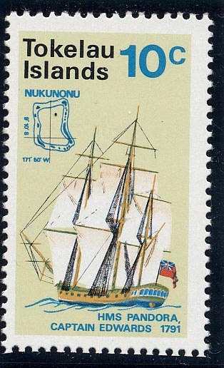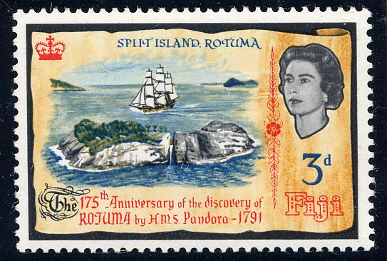 On August 8th 1966, Fiji issued three stamps commemorating the 175th anniversary of the discovery of Rotuma by Capt. Edward Edwards, R.N., in H.M.S. Pandora. In August 1790, the Pandora was commissioned by the Admiralty to search for mutineers from the Bounty. His orders were: "You are to keep the mutineers as closely confined as may preclude all possibility of their escaping, having however proper regard to the preservation of their lives, that they may be brought home to undergo the punishment due to their demerits".