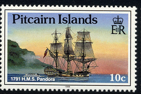 H.M.S. Pandora; built at Deptford, 1779, by Adams and Barnard. Sixth Rate of 24 guns; 520 tons; length 114'/2 ft., beam 32 ft. in 1791, she was commissioned by Capt. Edwards, R.N., to search for the Bounty mutineers, picking up 14 at Tahiti. After calling at Rotuma Island on August 8, 1791, she ran aground on the Great Barrier Reef with the loss of 39, including four prisoners.