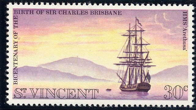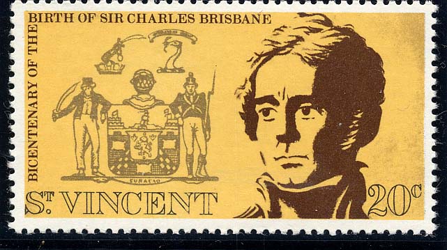 The bicentenary of the birth of Sir Charles Brisbane has been commemorated by three stamps of St. Vincent. Sir Charles was the fourth son of Admiral John Brisbane, who died in 1807, and was entered on board his father's ship, H.M.S. Alcide, in 1779. He was present at the Battle of Cape St. Vincent, and the relief of Gibraltar in January 1780, and afterwards in the West Indies. At the end of 1781 he was transferred to the Hercules, under Capt. Savage, and was present as a midshipman at the Battle of the Saints on April 12, 1782, being badly wounded by a splinter. He served under Rodney, Hood and Nelson, and was promoted to the rank of lieutenant, on November 22, 1790. Sir Charles went out to the Mediterranean in 1793 in the frigate Meleager, and came under the direct orders of Nelson. He was actively employed ashore at Toulon, and then at San Fiorenzo and at the siege of Bastia. Like Capt. Horatio Nelson, he too received a severe wound in the head, losing an eye, as a result of shot splinters.