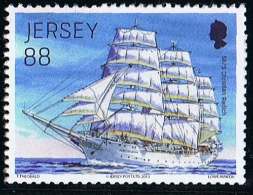 Christian Radich, of Norway, named after the donor whose money purchased the ship. She is a steel auxiliary full-rigged ship, launched in 1937, at Sandefjord, Norway, by Framnaes, for the Oslo Schoolship Association. She is a vessel of 676 tons with an auxiliary engine capable of giving a speed of 8 knots. Sail area is about 11,700 sq. ft. She carries no cargo other than the necessary stores and equipment. The vessel's complement is: captain; three mates; schoolmasters or instructors; doctor; engineer steward; cook; and 100 cadets. She made her first cruise in 1938. During the war she was taken over by the Norwegian Navy and used at Horten Naval Base. Captured by German forces during the invasion, she had to be rebuilt after the war because of the serious damage and this was completed in 1947. She resumed training in that year. She is a ship of 208 net tons. Length 205 ft.; breadth 32 ft.; draft 15ft. 6 in.; depth 18 ft. 9 in. SG361