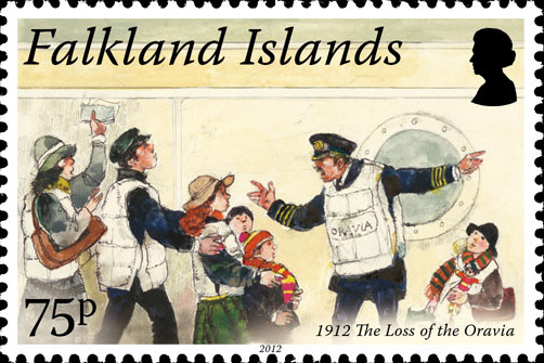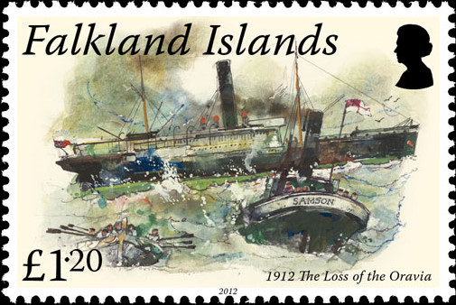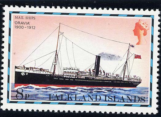 1900-1912. A steel, twin-screw steamer built in 1897 by Harland and Wolff, Ltd., Belfast, for The Pacific Steam Navigation Company, having a gross tonnage of 5,321, net 3,318 on dimensions 421 ft. x 48 ft. 8 in. x 33 ft. depth. Two triple-expansion engines developed 568 nhp. The PSNC held the mail contract for the Falkland Islands colony from 1900 to 1917 and their vessels called at Port Stanley on the outward and homeward voyages to and from Valparaiso or Callao. On November 12, 1912, the Oravia was wrecked on the Billy Rock, Port William, Falkland Islands. No lives were lost.