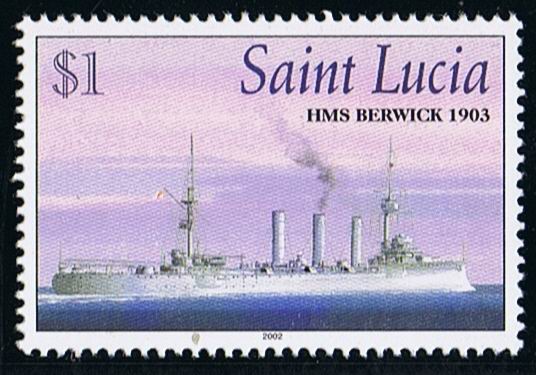 On April 2, 1908, the BERWICK, commanded by Capt. W.C.M. Nicholson, collided with and sank the destroyer TIGER off the Isle of Wight, during night manoeuvres. Unhappily the lives of 36 men were lost in this unfortunate accident. The BERWICK appears on this stamp by accident. She called at Kingston, Jamaica, in June, 1919, on her way home from the Pacific, via the Panama Canal, and was at the quayside when the West Indian Regt. arrived home, their transport being tied up behind the Cruiser. On some of these stamps there is a misplacement of the St. Patrick's Cross on the flag on the left hand side of the stamp, giving the appearance that it is flying upside down. BERWICK was sold on July 1, 1920, and was towed to Hamburg on August 28, 1922 for breaking up.