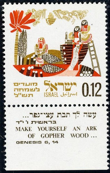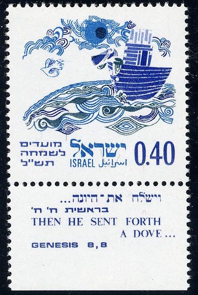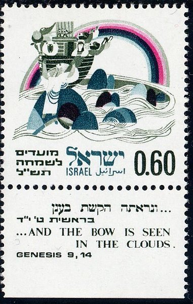 . Israel has prepared a special festival issue of stamps for the Jewish New Year of 5730 (1969), the designs being delightfully whimsical without any disrespect to Noah. All are based on the Biblical record of the Flood.