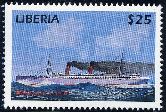 In Oct 1910 temporarily commissioned into the Royal Navy and manned by naval personnel in order to carry members of the Royal Family for the inauguration of the newly formed Union of South Africa. At the outbreak of WWI chartered as a Troopship carrying American troops across the Atlantic. Returned to mail service 1919 and passenger accommodation changed to 120 First 68 Second and 230 Third class passengers. In 1939 passenger capacity was given as 307 first, 230 third and 206 Tourist class. Sold May 1939 for breaking up Newport, Mon. for about £37,000 - Staffa 1974. Local issue 30p. NC (LB 5/128. Woad. WP Jan 98)