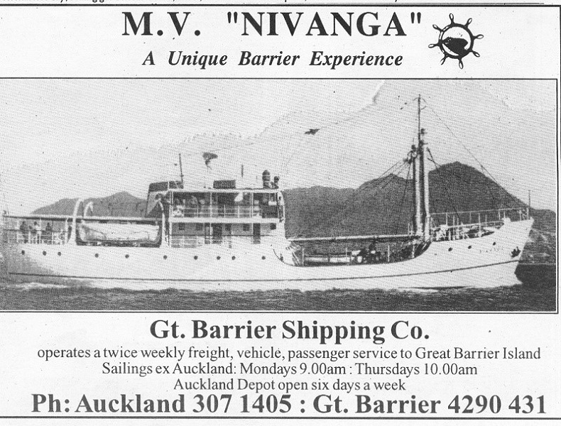 June 1994 sold to Neil Carter & Irene Juni Wright (Great Barrier Shipping Ltd.) Used in the twice-weekly service with cargo and passengers from Auckland to the Great Barrier Island. Licensed to carry 200 tons of cargo and 100 deck-passengers. Tonnage given as 369 gross, 113 net.