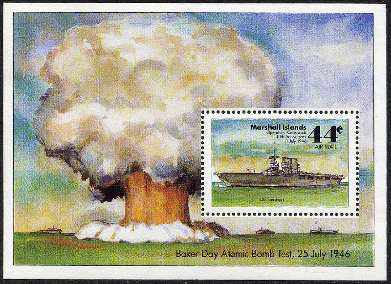 With the arrival of large numbers of Essex-class carriers, SAROTOGA was surplus to postwar requirements, and she was assigned to Operation "Crossroads" at Bikini Atoll to test the effect of the atomic bomb on naval vessels. She survived the first blast; an air burst on 1 July, with only minor damage, but was mortally wounded by the second on 25 July, an underwater blast which was detonated under a landing craft 500 yards from the carrier. Salvage efforts were prevented by radioactivity, and seven and one-half hours after the blast, with her funnel collapsed across her deck, SARATOGA slipped beneath the surface of the lagoon. She was struck from the Navy list on 15 August 1946.