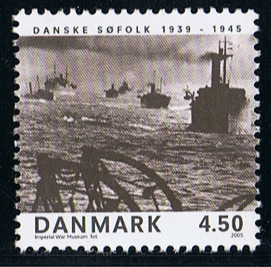 The photograph on the DKK 4.50 stamp shows a convoy off the east coast of Britain, where many Danish merchant vessels sailed. The photograph is reproduced by kind permission of the Imperial War Museum in London.