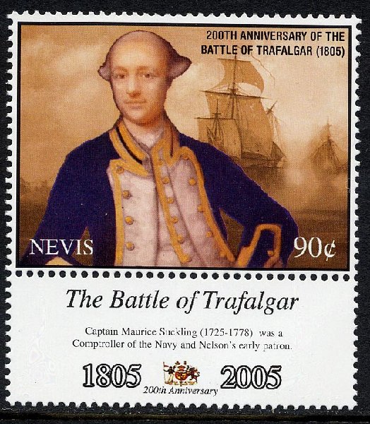 These appointments coming his way by virtue of his uncle Captain Maurice Suckling (1), Comptroller of the Navy and MP for Portsmouth no less. In the West Indies he shared lodgings with William Cornwallis (2), later Admiral Cornwallis. These two men who had an early influence on Nelson are shown on the two stamps from Nevis.