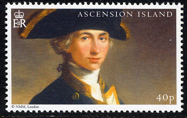 Nelson appears on many stamps that are copied from painted portraits. According to Lord Vincent, Nelson sat for "every painter in London".The first portrait as an eighteen year old Lieutenant by John Francis Rigaud was begun in 1777 and completed in 1780 . It shows Nelson in post captain's uniform with the fortress ofSan Juan Nicaragua in the background (3). This was used on the 40p Ascension Island stamp (3a).