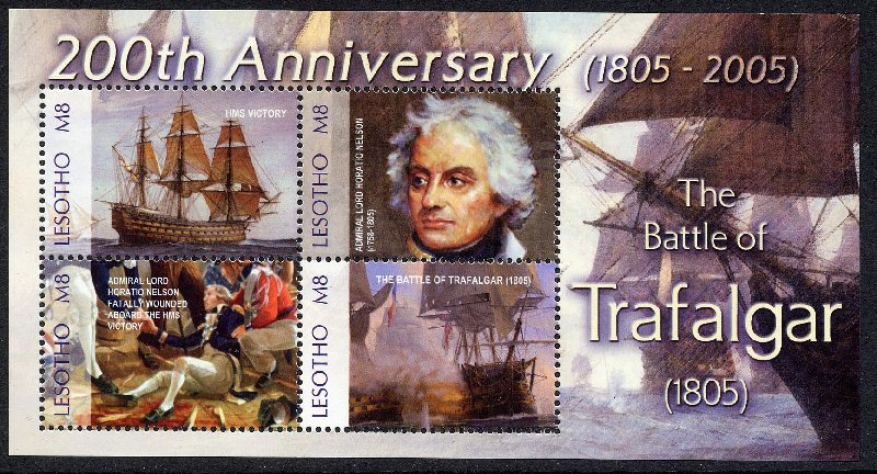 The Grenada mini-sheet of the 200th Anniversary of Battle of Trafalgar shows Nelson, Napoleon Boneparte, HMS Victory and, from a painting by William Marshall - "Nelson's Band of Brothers", but more correctly "Nelson explaining his plans for the Battle to his captains".(7)